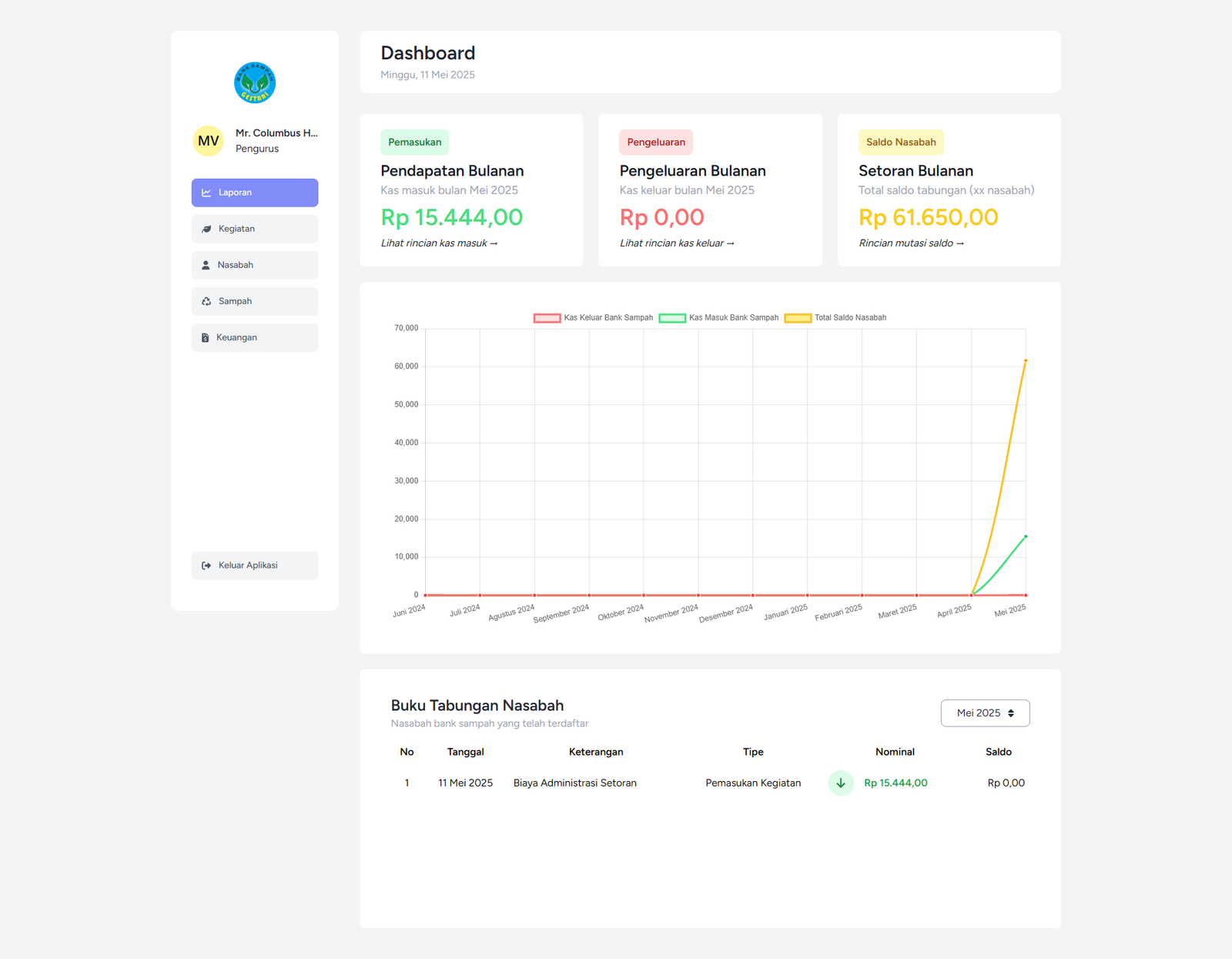 Halaman Dashboard merupakan tampilan utama setelah pengguna berhasil login. Di halaman ini, pengguna dapat melihat ringkasan aktivitas dan kondisi keuangan Bank Sampah secara real-time.