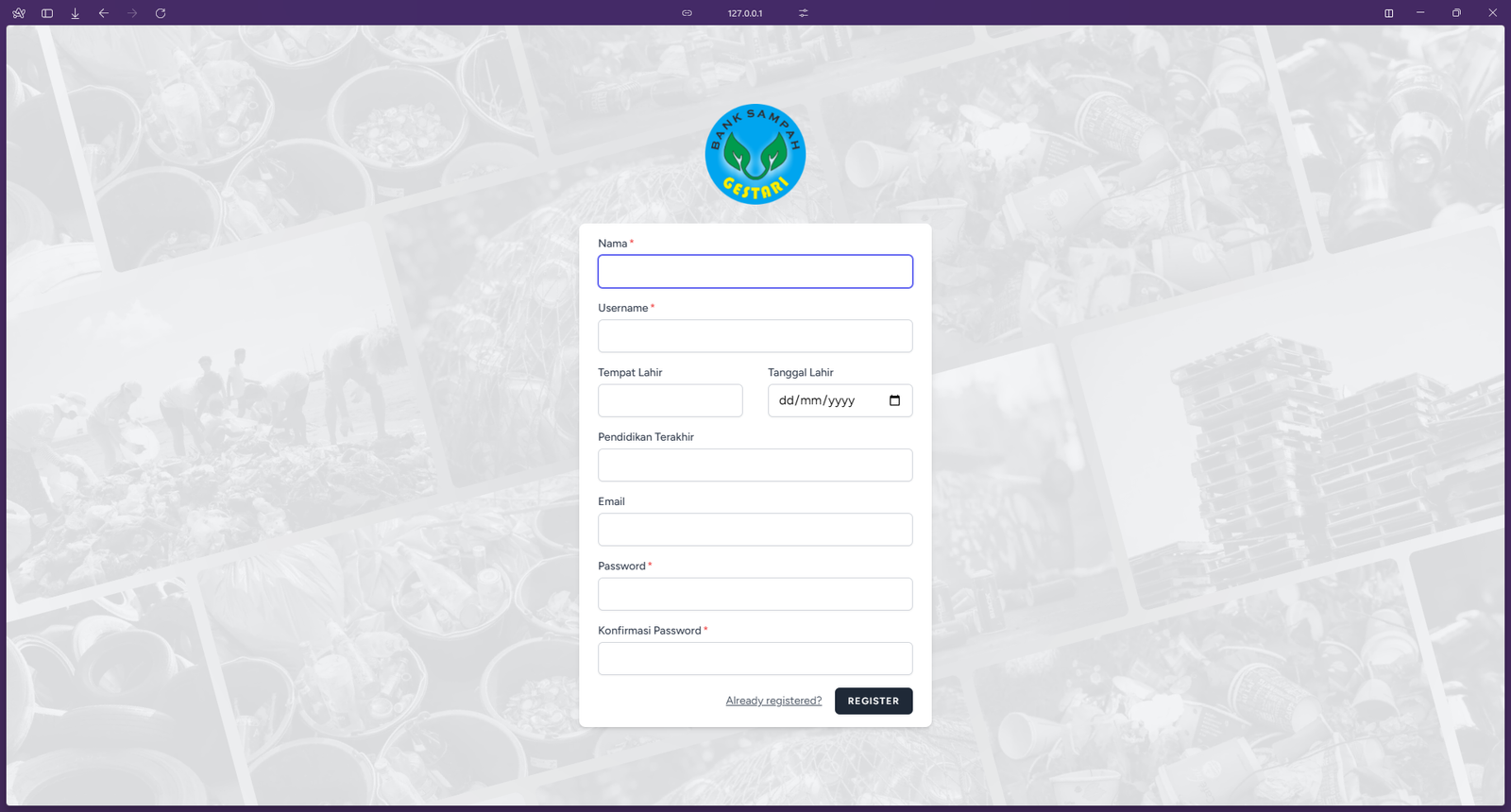 Halaman register akun berfungsi untuk mendaftarkan akun untuk masuk kedalam website administrasi bank sampah.